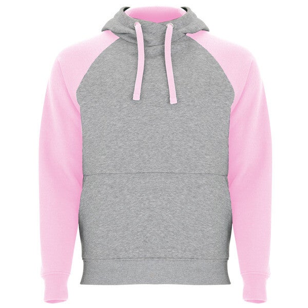 Sudadera unisex bicolor con capucha forrada. Manga ranglán. Puños y cinturilla en canalé 1x1 con elastano. Cubrecosturas del mismo tejido. Cordón plano en capucha y ojales metálicos.